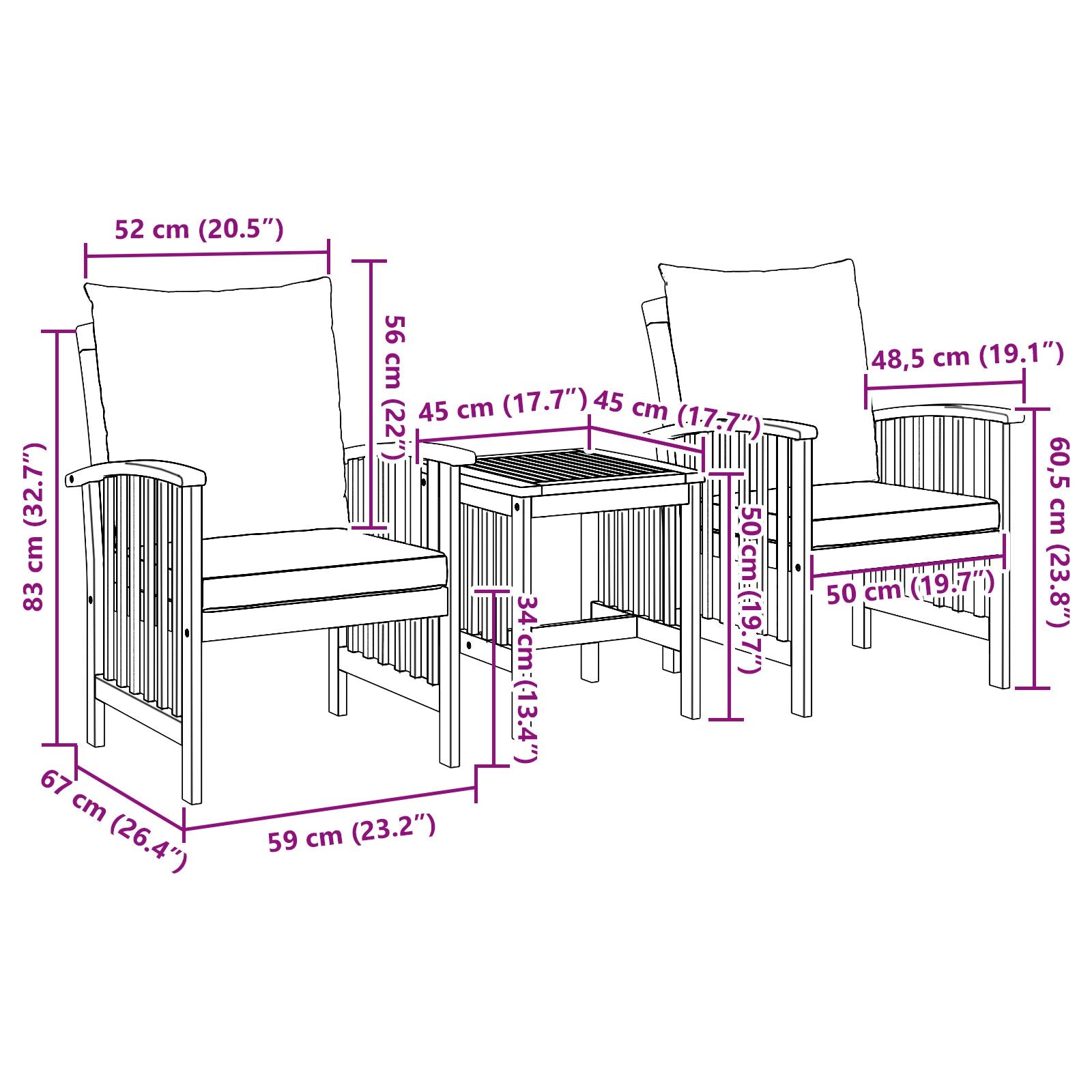 Our outdoor dining set comes with two trendy armchairs and a beautifully designed table, making it just right for alfresco meals or relaxing coffee breaks. Made from solid acacia wood, it looks great and offers loads of comfort thanks to its soft cushions. It's a fab addition to any patio or balcony.